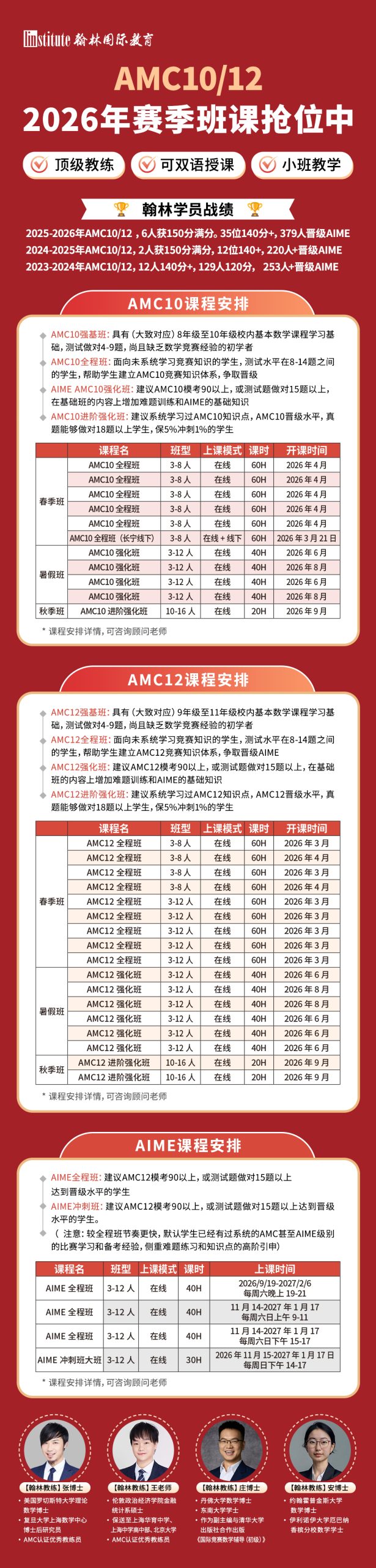 冲刺班一般在9月秋季开学之后,比赛两个半月之前开设。班级默认学员已经对于AMC或数学竞赛有过一定程度系统性的学习,在比较紧凑的课时内快速扼要地给学生梳理各个重要板块的核心知识点,并主要以典型真题讲解的方式来帮助学生在冲刺阶段高效率备考。
